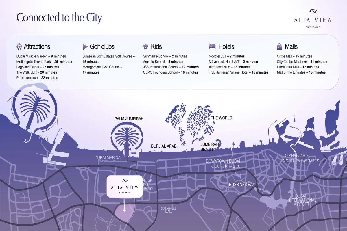 Alta V1ew Skyhomes is located in Jumeirah Village Circle, offering excellent connectivity to major landmarks, business hubs, and lifestyle destinations in Dubai.