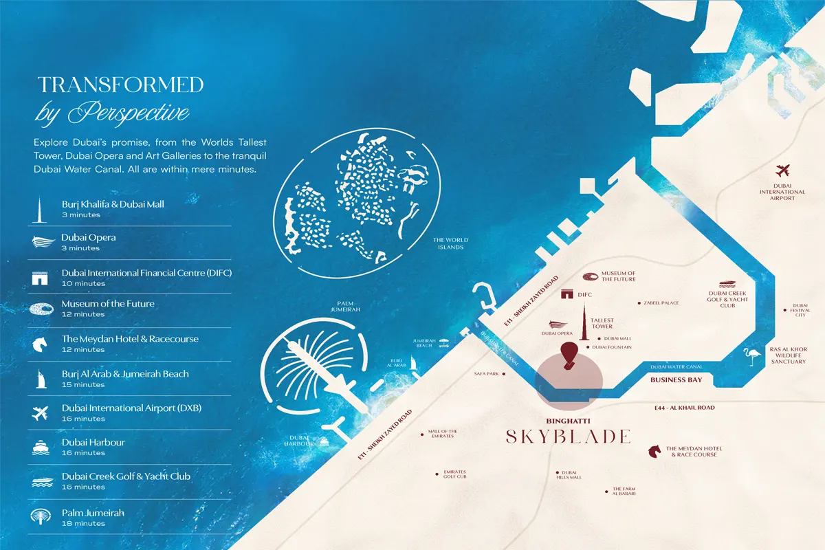 Binghatti Skyblade is located in Downtown Dubai, offering excellent connectivity to major landmarks, business hubs, and lifestyle destinations in Dubai.