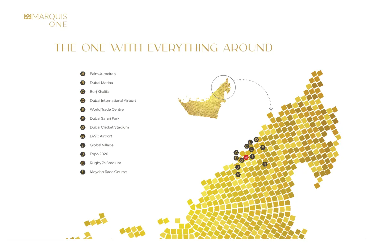 Marquis One is located in Arjan, offering excellent connectivity to major landmarks, business hubs, and lifestyle destinations in Dubai.