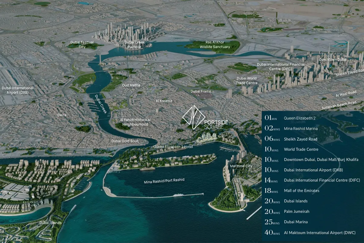 Portside Square is located in Mina Rashid, offering excellent connectivity to major landmarks, business hubs, and lifestyle destinations in Dubai.