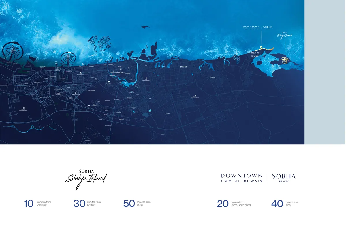 Pristine Beach Residences is located in Siniya Island, offering excellent connectivity to major landmarks, business hubs, and lifestyle destinations in Umm Al Quwain.